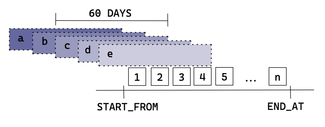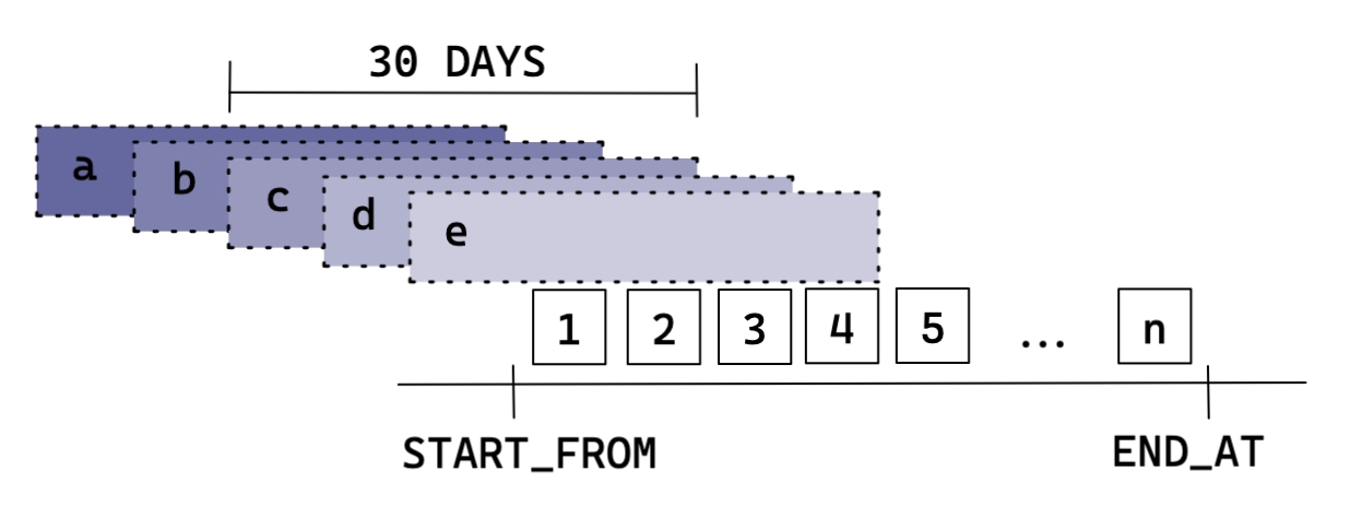 Within our diagram, this means that each block now represents 30 days of data. For example, if we set START_FROM = timestamp '2022-01-01 00:00:00'