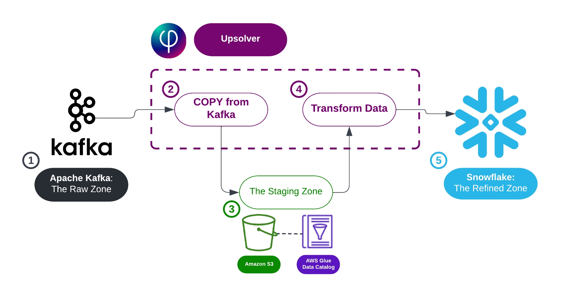 The following steps illustrate how to create a data pipeline that reads from a Kafka raw zone, stages the data in the staging zone, and then performs basic transformations before writing the results to a refined zone such as Snowflake, from where you can query the results.