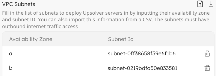 After entering the VPC ID, enter the Subnets that the Upsolver servers will be deployed to. The Availability Zone and Subnet ID can be found in the Subnets section of the VPC console. You can either enter these into the deployment form manually or import them via a CSV file.