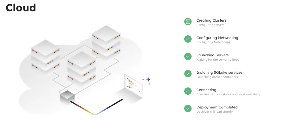 Back in Upsolver, you will be greeted by a message that the integration was successful, followed by a screen detailing the remaining steps in the deployment, such as installing the Upsolver software and configuring the servers. This process should take between three and five minutes to complete.