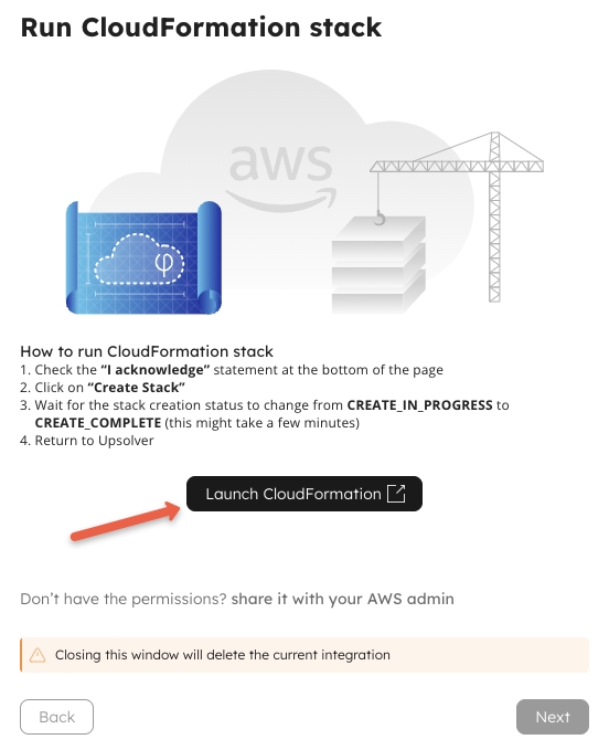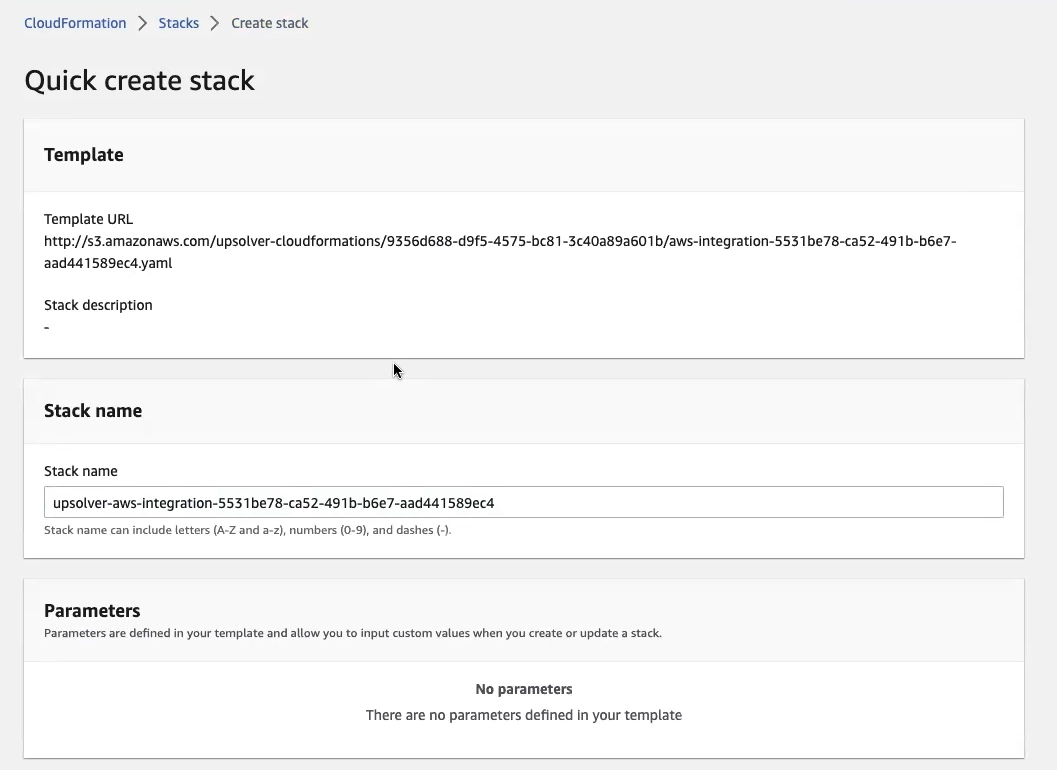 Before you can launch the CloudFormation stack, click the Launch CloudFormation button, which will redirect you to the AWS Console in a new browser window. Login using the IAM user you created as a prerequisite, with the required IAM permissions to launch the stack.