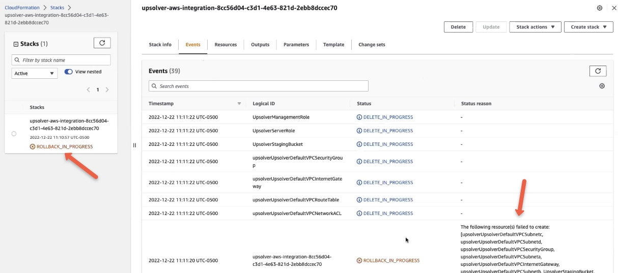 If any errors are encountered during the deployment process, you will see them here and the stack will be rolled back. All resources that were previously created by the stack will be deleted, so there is no need for you to manually clean up any deployment that did not succeed. After the rollback is marked complete, you can fix any errors and try again.