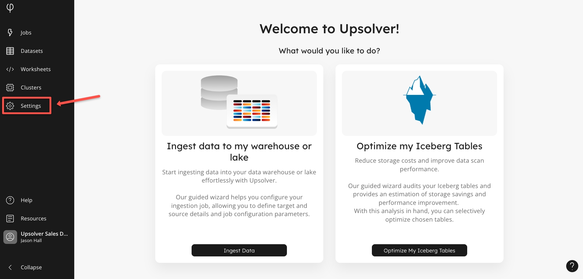 If this is your first time signing in to Upsolver, you will be greeted with the screen shown below. Please navigate to the Settings tab of the console, as shown below: