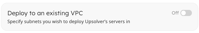 By default, when deploying Upsolver, Upsolver will create a new VPC in your AWS account where all the resources will be deployed. You may choose to deploy Upsolver into an existing VPC by enabling this option.