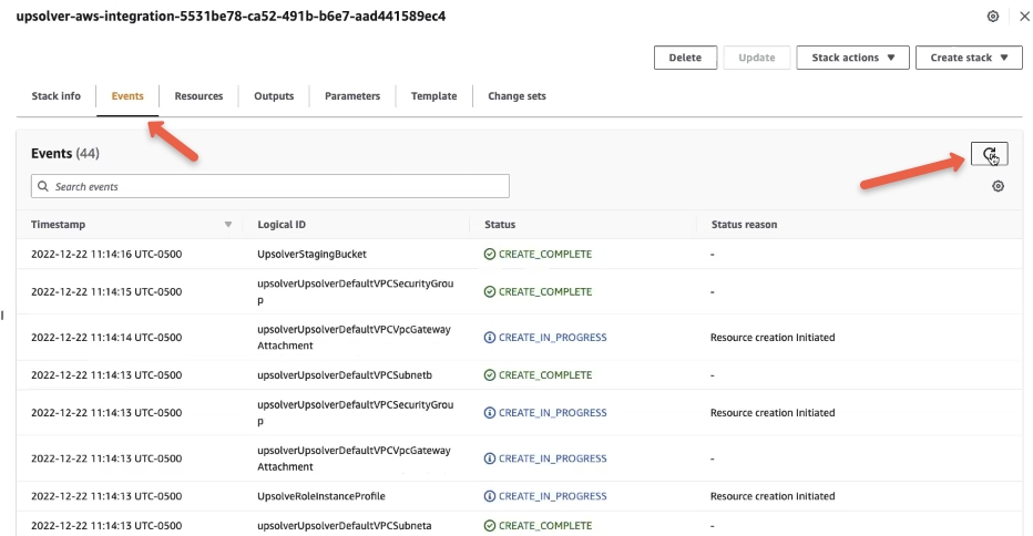 The CloudFormation console will automatically refresh periodically updating you on its progress. You can track the detailed progress of each stage in the stack by clicking on the Events tab, and for quicker updates, manually refresh the page. You will see certain events in progress and others that have been completed.