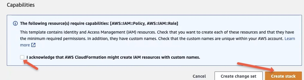 Scroll to the bottom of the page and check the box I acknowledge that AWS CloudFormation might create IAM resources with customer names. Then click the Create stack button.