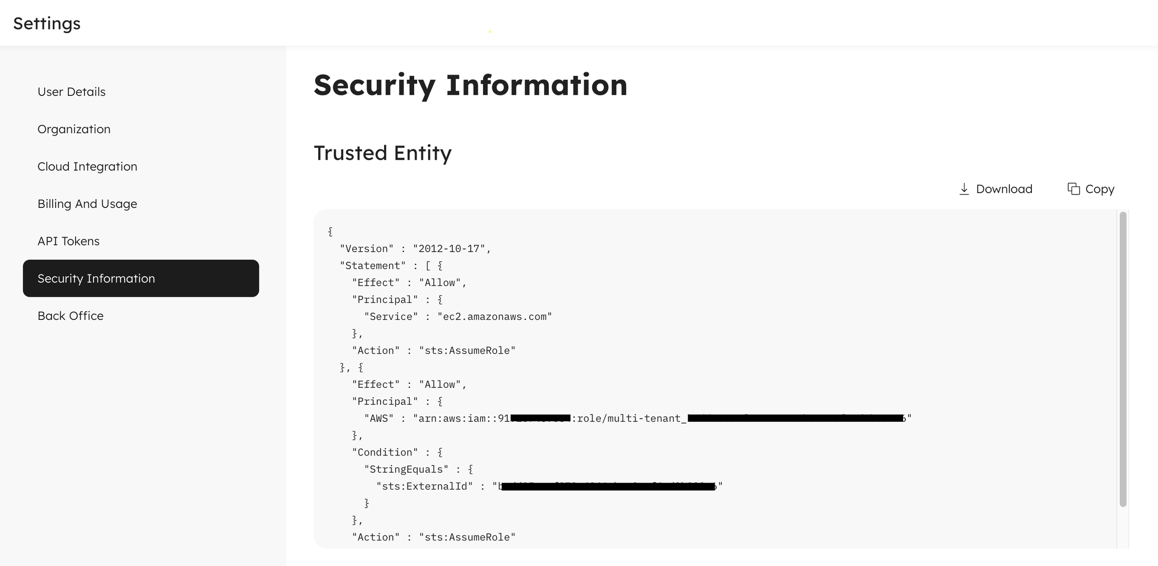 From Upsolver's Security Information page, you can copy the trusted entity that Upsolver assigned to your organization and paste it here: