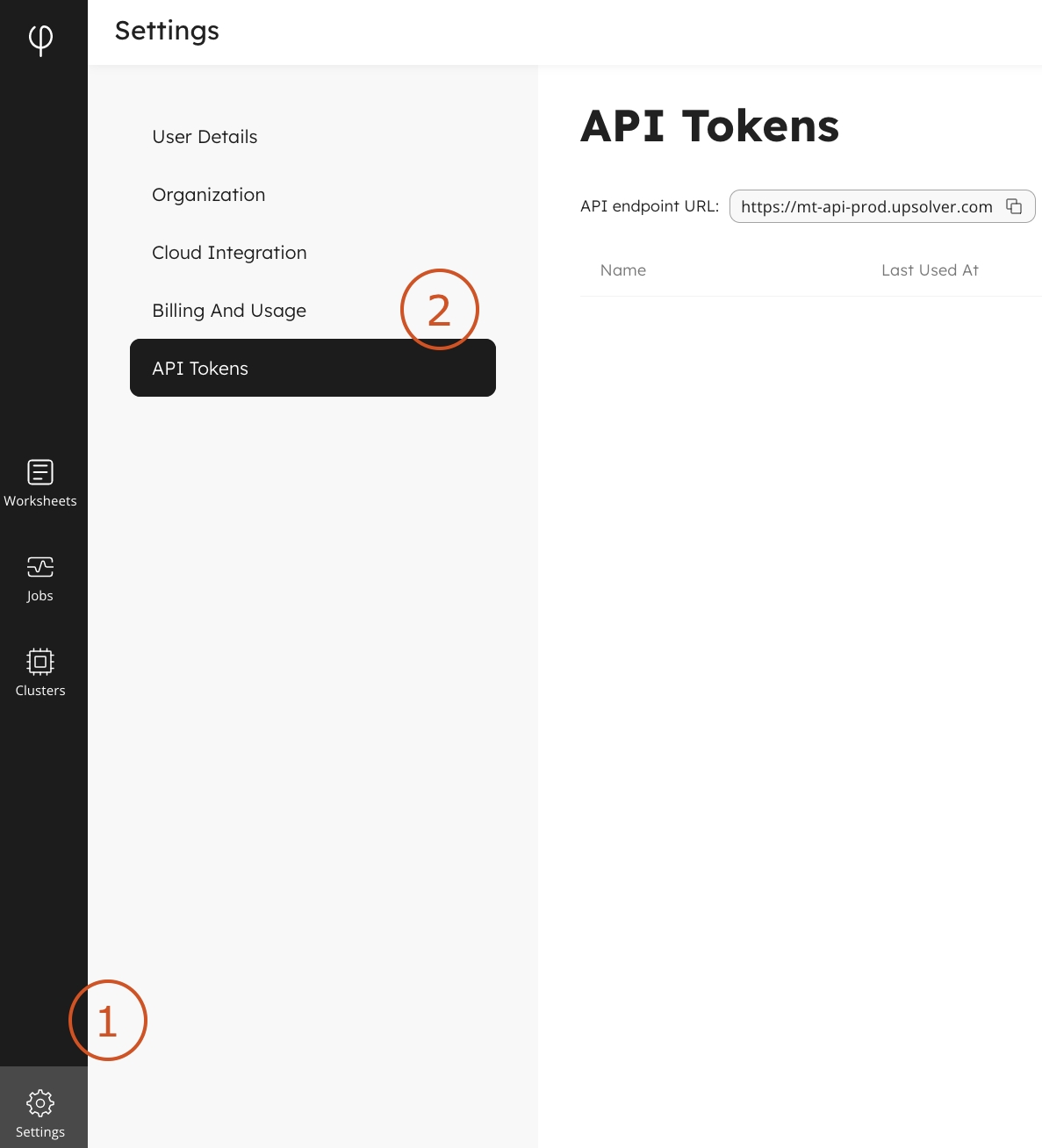 Controlling access to the API is performed by creating API tokens in the Upsolver console. Start by clicking the Settings button in the bottom left corner of the console, followed by selecting the API Tokens menu item, as shown below: