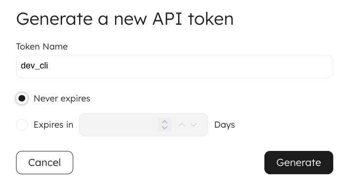 Next, click the Generate button at the top right corner. In the dialog box enter a name for your token and select if and when the token should expire.