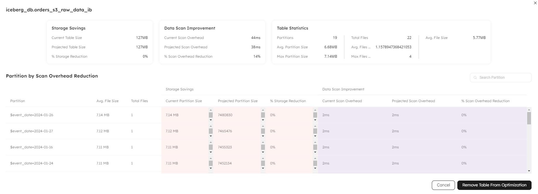You can view more detailed insights on a table by clicking the information icon at the far right of the row, or by clicking on the Table Name link. This displays a pop-up window with more statistics on the potential storage savings and data scan improvement: