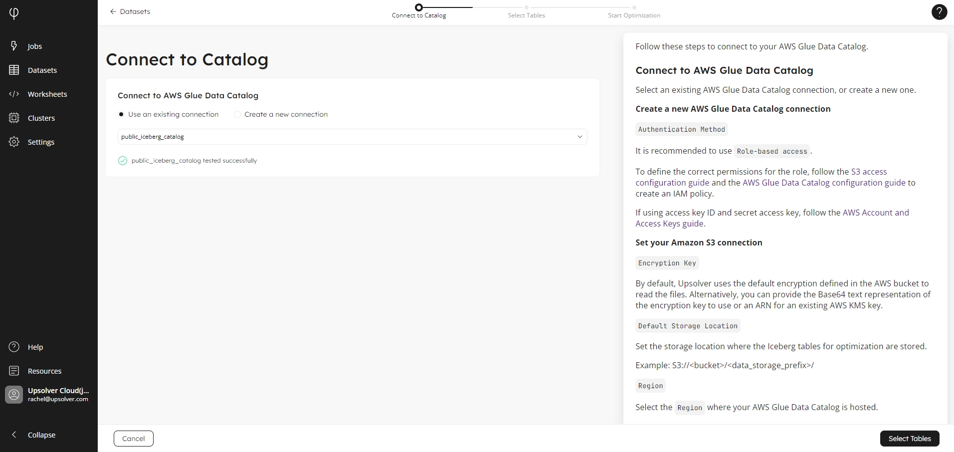 When you have connected to your catalog, click Select Tables to continue to the next screen.