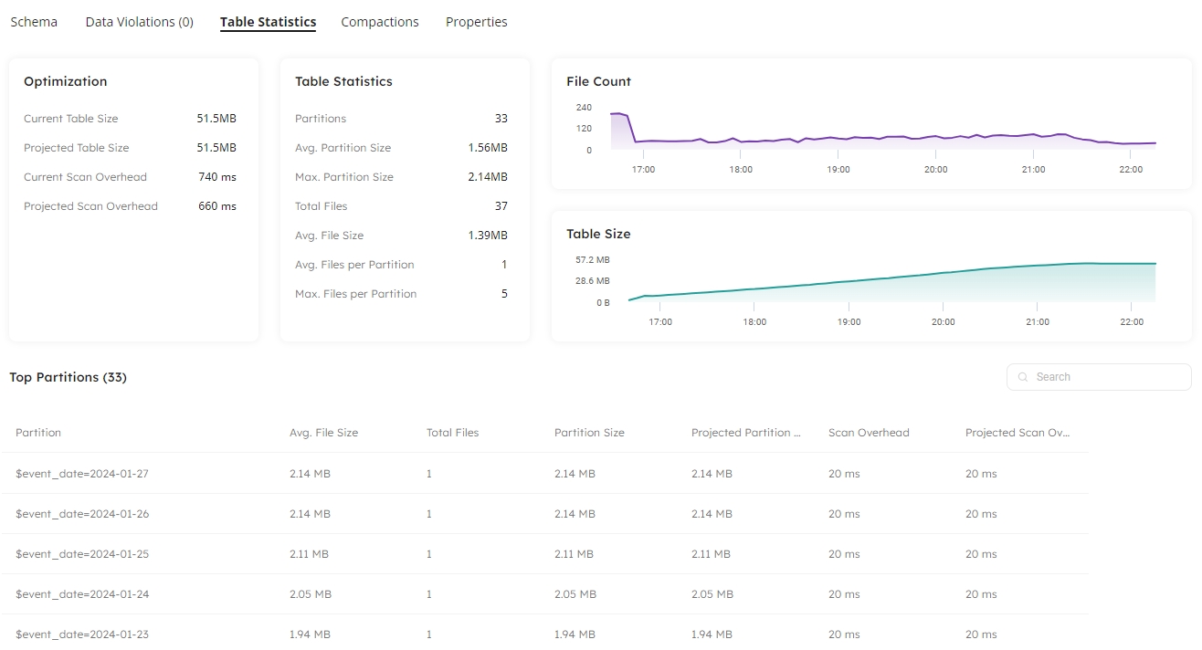 In Datasets, you can click on the table you selected for optimization to view the status of the optimization process, and see space savings. The Table Statistics tab displays running values for the count of files and partitions, the size of the table and potential savings: