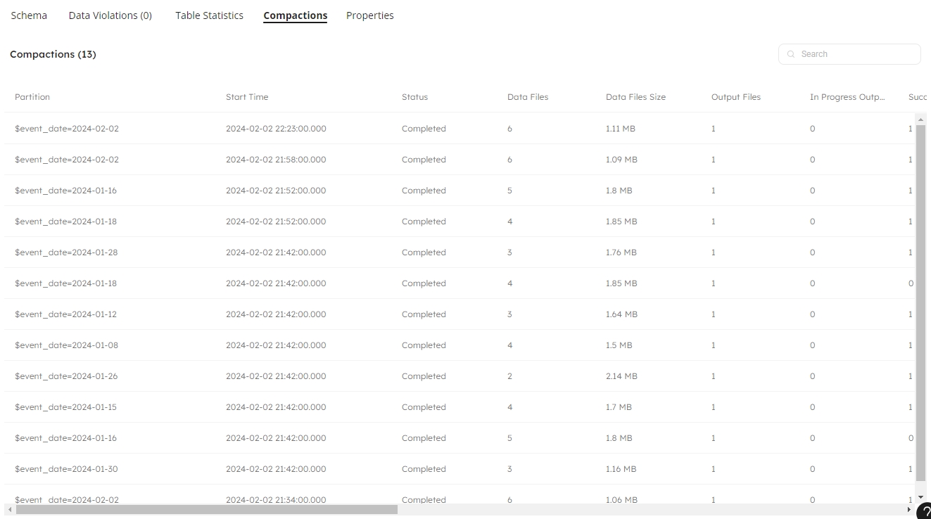 Click on the Compactions tab to view the status for each partition: see the Start Time and Status, and the number of Data Files and the Data File Size, and scroll to the right to view information on equality and position delete: