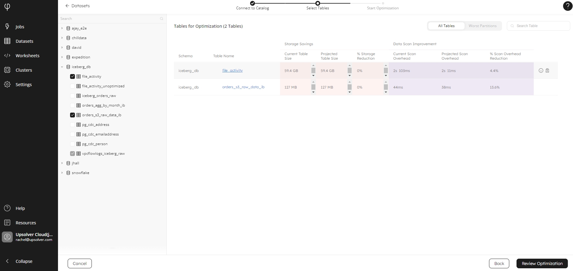 Click Remove Table from Optimization, or Cancel to close the window. Having selected your tables, click Review Optimization to navigate to the next screen when you can confirm your selection.