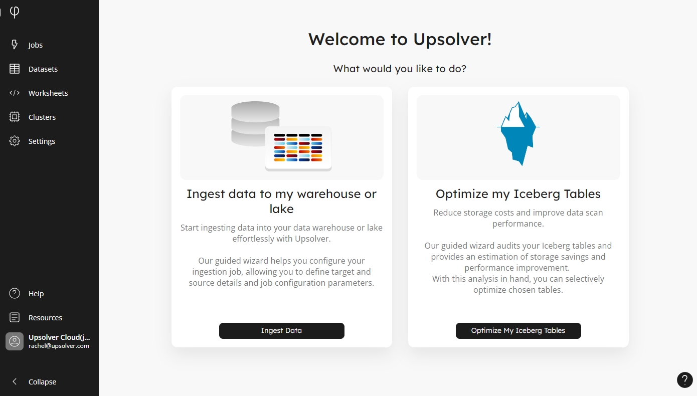 Login to Upsolver and from the home screen select Optimize My Iceberg Tables. You can also click on the Upsolver logo at the top of the menu to view this screen: