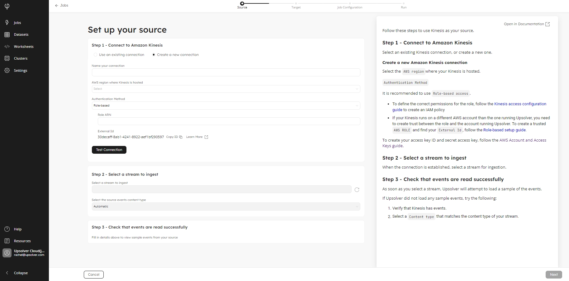 If your Kinesis runs on a different AWS account than the one running Upsolver, you need to create trust between the role and the account running Upsolver. To create a trusted AWS ROLE and find your External Id, follow the Role-Based AWS Credentials guide.
