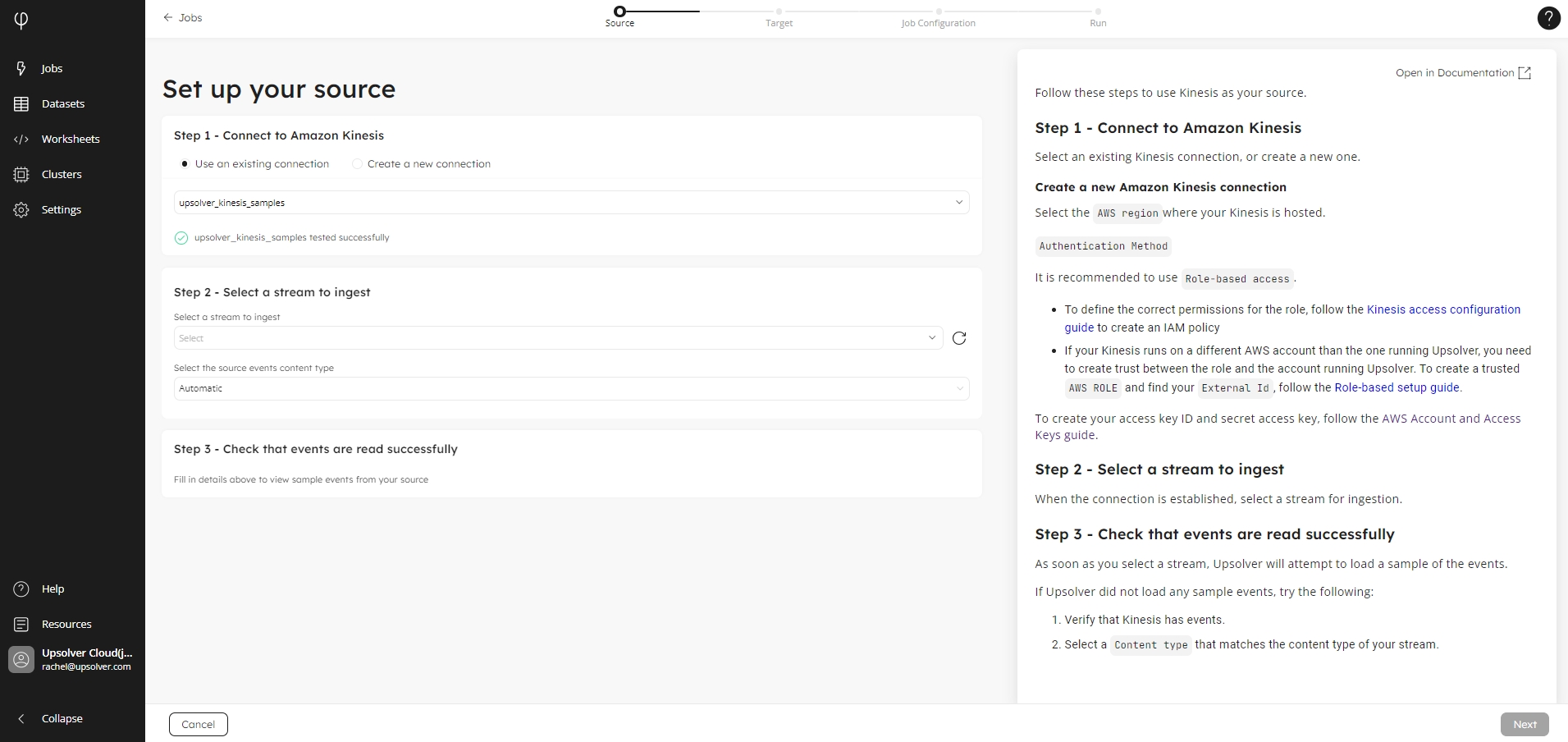 By default, if you have already created a connection, Upsolver selects Use an existing connection, and your Kinesis connection is populated in the list.