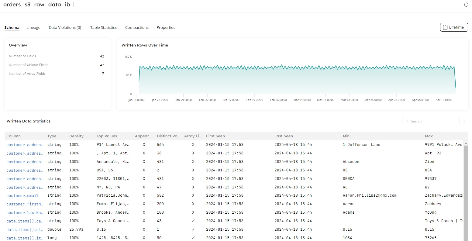 The Datasets tab in Upsolver provides essential insights into your data and tables, enabling you easily to uncover performance problems, and troubleshoot and diagnose data quality issues. These insights are available to everyone in your organization, meaning anyone can drill deep into the data statistics and observe the health of your data.