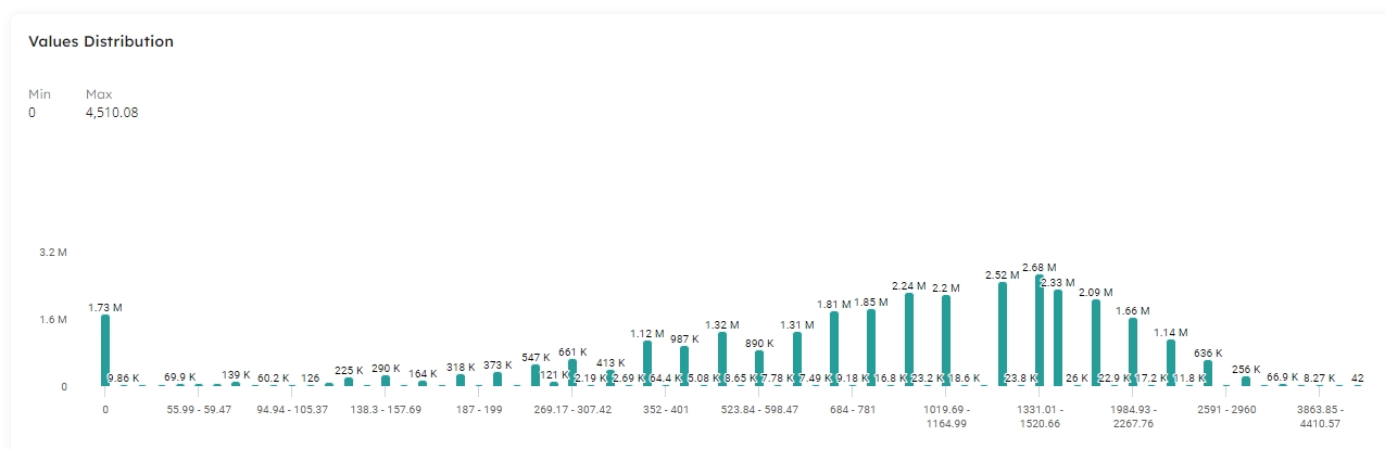 The Values Distribution chart makes it easy to visualize your data and find anomalies and outliers. It is easy to see the spread of values across the range within your dataset and also discover the Min and Max values within the column.