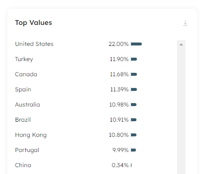 The Values by Frequency card displays the top 10K distinct values in the selected column and the percentage of rows for each value that appears within the dataset. This is particularly helpful for columns written to dimensions, as the values here should match the values in your analytics target: