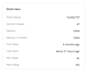 The Min and Max stats provide real-time visibility into the strings in your columns. If you have a column whereby the minimum string length should be 13, such as a barcode field, you can use this card to check ingested values.