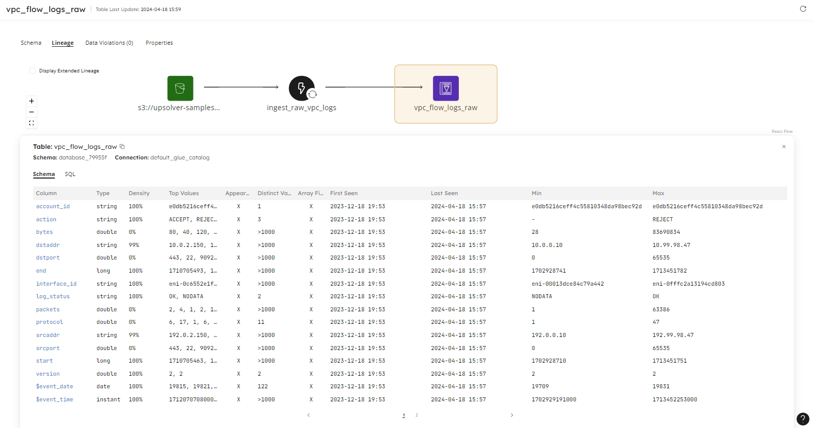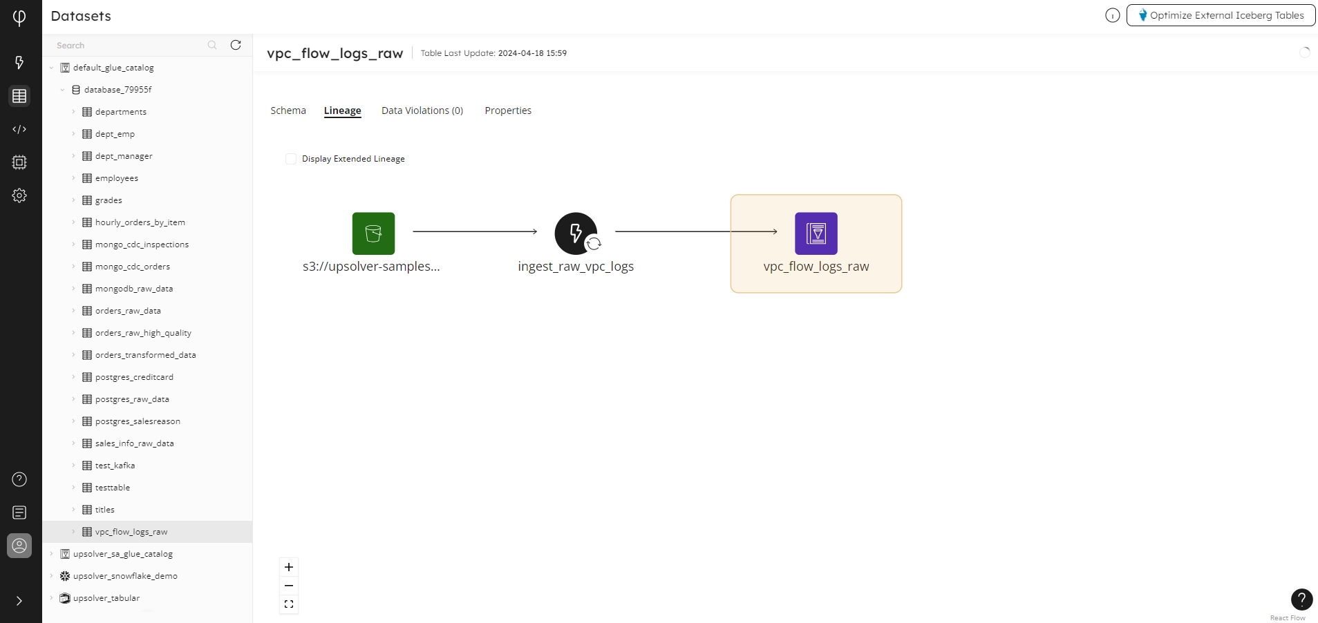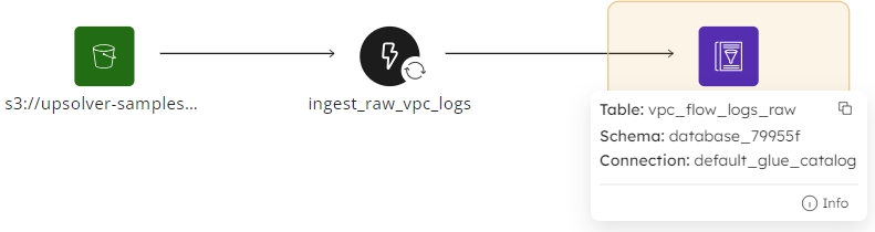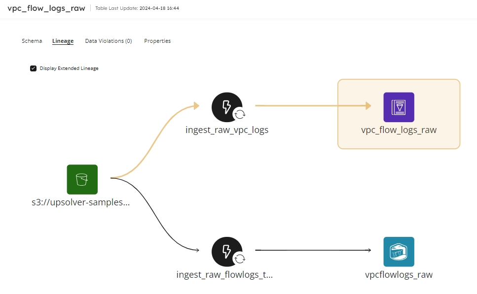 The Lineage tab is visible for source and target datasets managed by Upsolver to provide an insight into the data journey, visually displaying where datasets and jobs interact, enabling you to drill into each entity, and see how pipelines and datasets relate and connect.