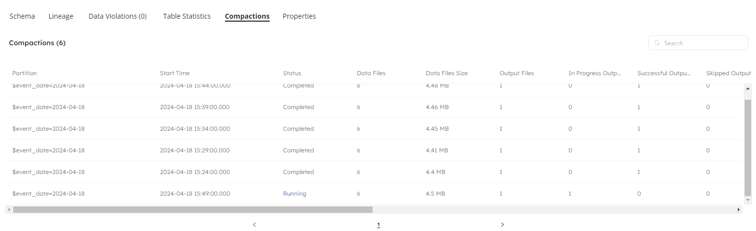 The Compactions tab is visible if you have used the Iceberg Table Optimizer to tune your tables, or are using Upsolver to ingest data to Iceberg.