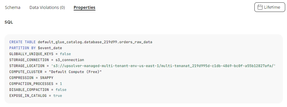 The SQL section is visible for staging tables created in your data lake, and supplies the SQL code used to create the table. Additional default job options may be visible that were not included in the initial code execution, but that Upsolver automatically applies when the table is created: