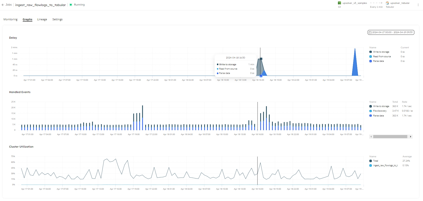 The Graphs tab visualizations deliver immediate insight into the performance of your job over a given period of time, enabling you to discover delays, the number of events that were handled, and how the cluster has been utilized.