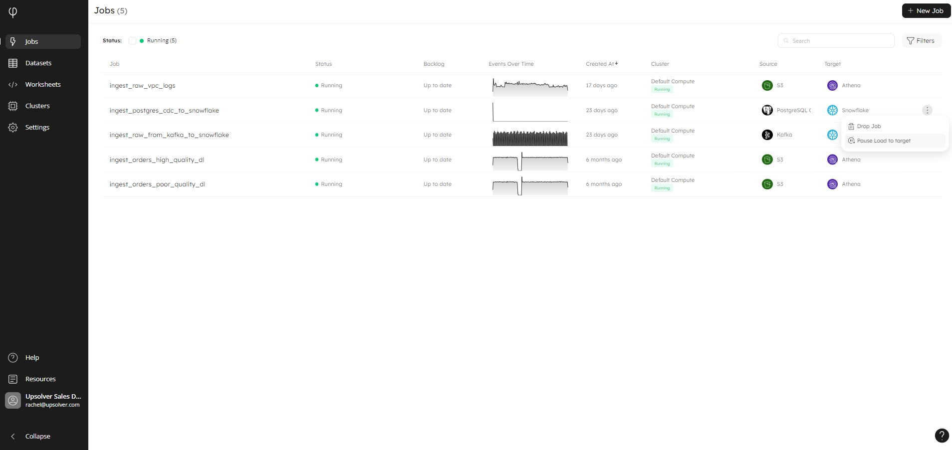You can pause and later resume a job using the syntax below, or directly from the Jobs page in the Upsolver user interface, by right-clicking on the individual job menu.