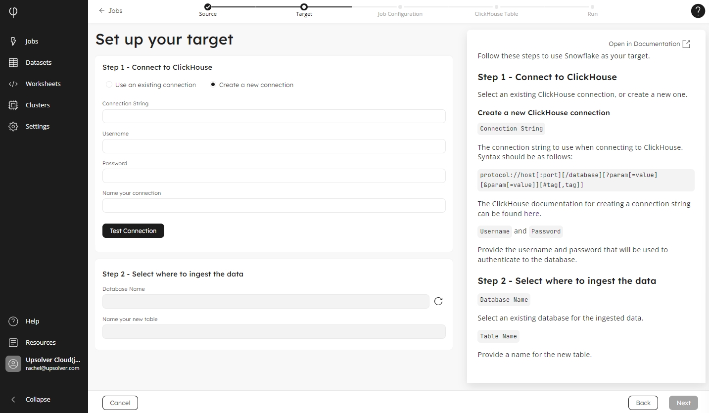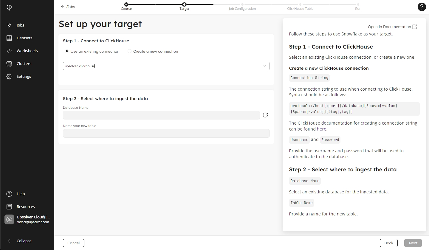 By default, if you have already created a connection, Upsolver selects Use an existing connection, and your ClickHouse connection is populated in the list.