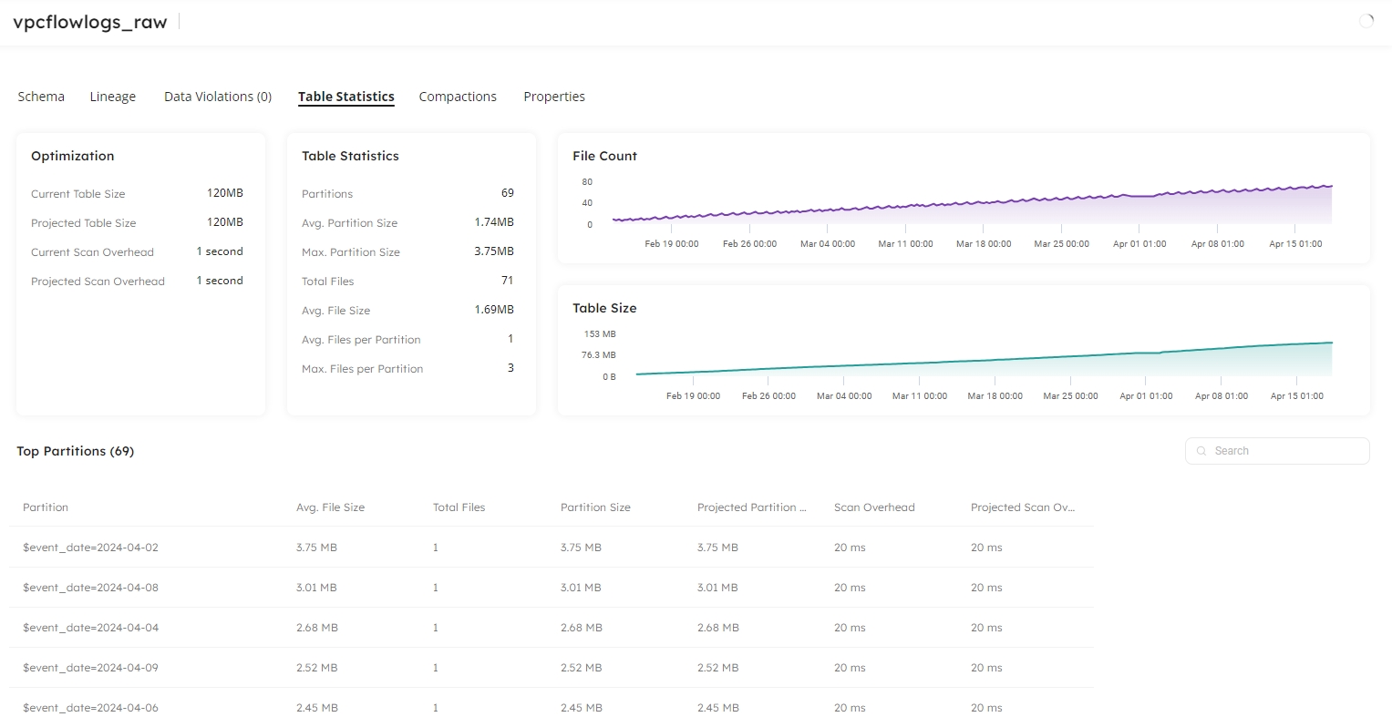 Upsolver supports ingesting data to Apache Iceberg tables, and the optimization of your lakehouse for external tables for data that has not been ingested by Upsolver. Whether you are using Upsolver to create your pipelines or simply to optimize your existing lakehouse, you can view statistics for your Iceberg tables within Datasets. Here, you will discover the storage space savings and performance benefits you will gain when Upsolver has optimized your tables.