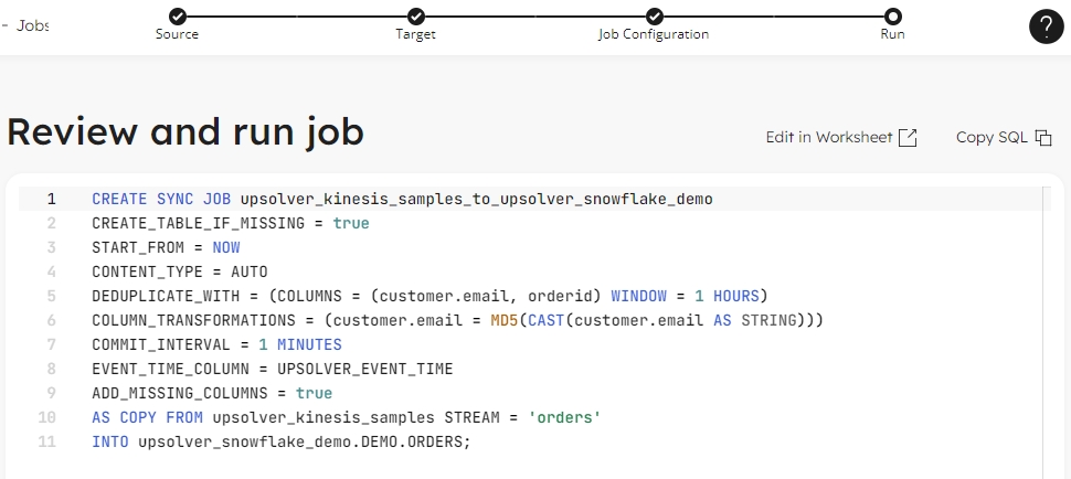 After completing the steps to connect to your source and target, and configure your job, Upsolver generates the SQL code that will be executed to create the job.