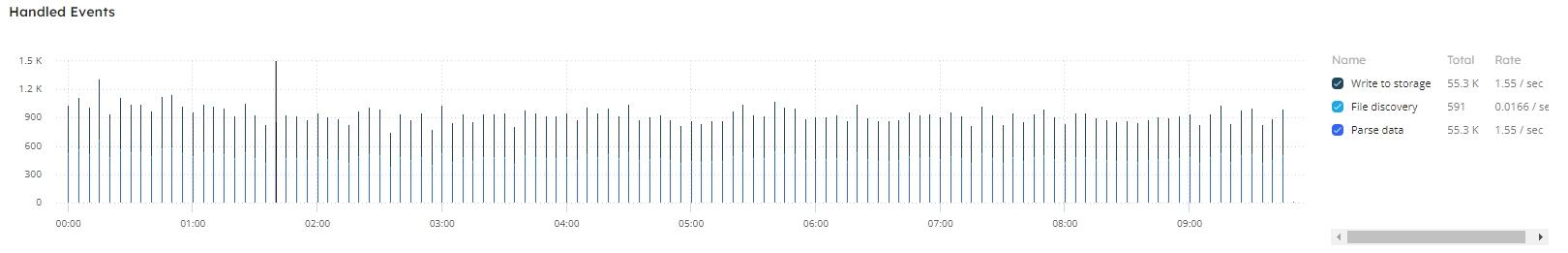 The Handled Events chart displays write to storage, read from source, and parse data over the time period selected in the date picker: