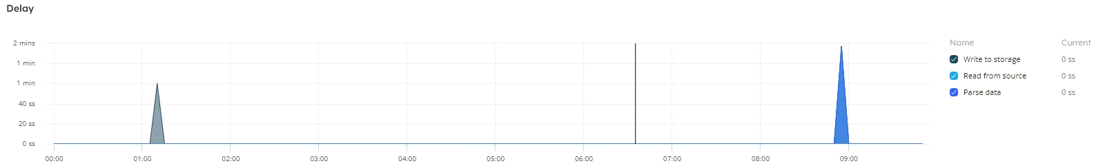 The Delay chart visually displays delays in write to storage, read from source, and parse data for your job. Depending on the job type, you may see only one of these options:
